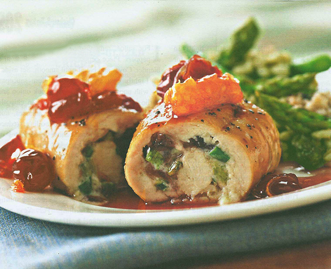Just for my friends Johanne and Louie! From Better Homes and Gardens New Grilling Book – Page 26 Ingredients ½ 8 ounce container Marscarpone Cheese ⅓ cup Dried Tart Red Cherries 3 tablespoons Green Onions 4 Boneless Chicken 1 tablespoon Brown Sugar ½ teaspoon Salt ¼ teaspoon Black Pepper 1 recipe Cherry Orange Sauce 1 teaspoon Orange Zest 1 Oranges ¼ cup Orange Juice ½ cup Cherry Preserves Method For the filling, combine marscarpone cheese, dried cherries and onions. Set Aside. Place a chicken breast half between 2 pieces of plastic wrap. Using the flat side of a meat mallet,…
